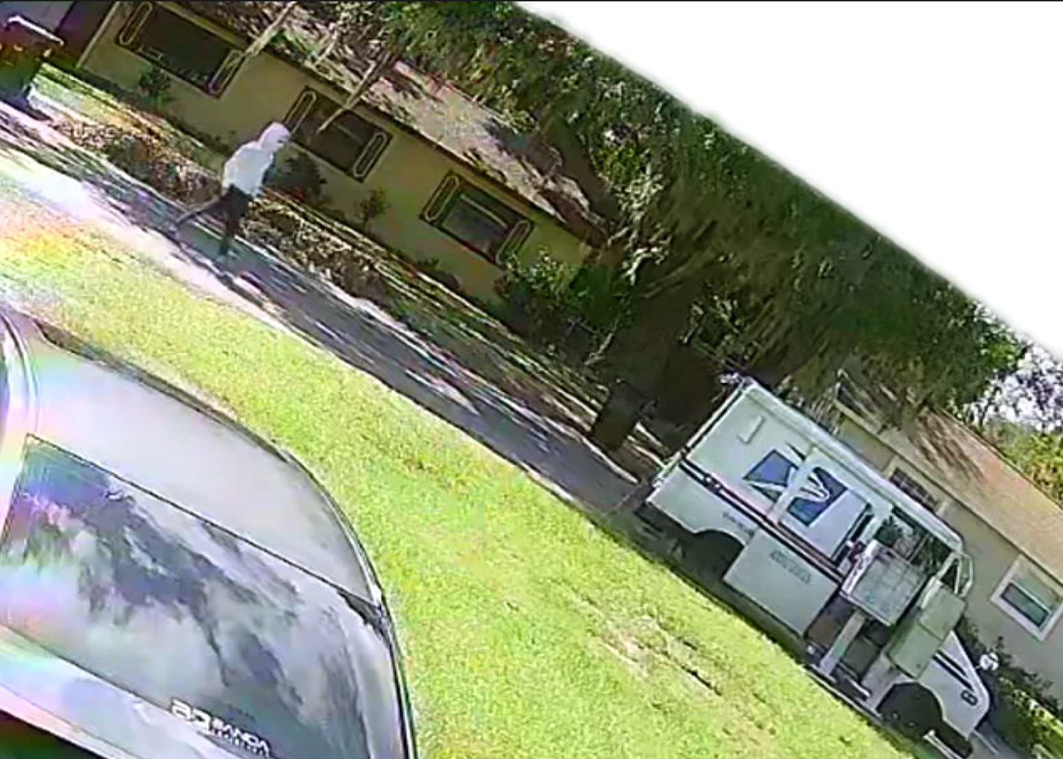 An October 2022 surveillance photo of an armed robber approaching a mail carrier. The Conversation via court records