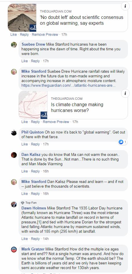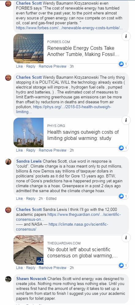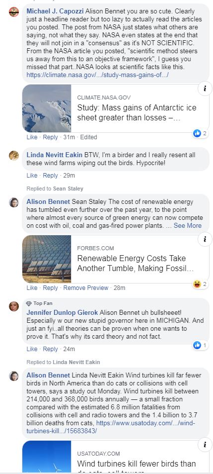 The estimated cost of measures to limit Earth-warming greenhouse gas emissions can be more than offset by reductions in deaths and disease from air pollution, https://phys.org/news/2018-03-health-outweigh-limiting-global.html#jCp The average cost of developing new power plants based on onshore wind, solar photovoltaic (PV), biomass or geothermal energy is now usually below $0.10/kWh. Wind costs $0.13/kWh. Power plants based on fossil fuels such as oil and gas, range from $0.05/kWh to over $0.15/kWh. Dorian’s appearance made 2019 the fourth straight year in which a Category 5 hurricane formed in the Atlantic — the longest such streak on record, Heat in the ocean is a hurricane’s primary source of fuel, and the world’s oceans have absorbed more than 90 percent of the warming of the past 50 years. https://www.climate.gov/news-features/understanding-climate/climate-change-ocean-heat-content Heat in the ocean is a storm’s primary source of fuel, and the world’s oceans have absorbed more than 90 percent of the warming of the past 50 years. https://www.climate.gov/news-features/understanding-climate/climate-change-ocean-heat-content Health savings outweigh costs of limiting global warming: study https://phys.org/news/2018-03-health-outweigh-limiting-global.html#jCp Wind turbines kill far fewer birds in North America than do cats or collisions with cell towers. Wind turbines kill between 214,000 and 368,000 birds annually — a small fraction compared with the estimated , 6.8 million communication towers , 57 million power lines , 214 million vehicles, 624 million from glass windows each year, and the 1.4 billion to 3.7 billion deaths from cats, https://www.usatoday.com/story/money/business/2014/09/15/wind-turbines-kill-fewer-birds-than-cell-towers-cats/15683843/ https://www.3billionbirds.org/findings Since that flawed 2015 Study, the bulk of scientific research suggests that Antarctica is losing more ice than it's gaining. A 2018 study that used the GRACE satellites to show that ice gains in East Antarctica haven't kept up with ice losses in the west, and that melting ice has added nearly 3 trillion gallons of water to the oceans over the course of 25 years. https://bigthink.com/politics-current-affairs/2015-nasa-study-antarctic-ice-climate-change-skeptic?rebelltitem=5#rebelltitem5 A 2016 Union of Concerned Scientists study(pdf) found that the manufacture and operation of electric vehicles produced less than half the carbon emissions of comparable petrol and diesel-powered vehicles. But this calculation assumes energy used in manufacture does not itself come from renewables. https://www.ucsusa.org/sites/default/files/attach/2015/11/Cleaner-Cars-from-Cradle-to-Grave-full-report.pdf#page=13