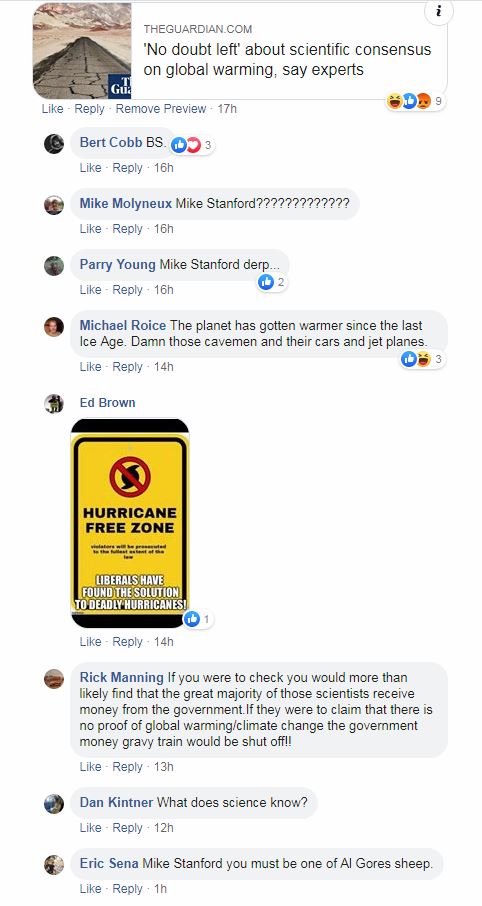 consensus: Climate is warming from man-made change. I think I'll go with the 12,000 academic papers https://www.theguardian.com/science/2019/jul/24/scientific-consensus-on-humans-causing-global-warming-passes-99 And NASA https://climate.nasa.gov/scientific-consensus/ After a study of 12,000 papers from here https://iopscience.iop.org/journal/1748-9326 “There was 99% scientific consensus in 2011 that humans are causing global warming.”