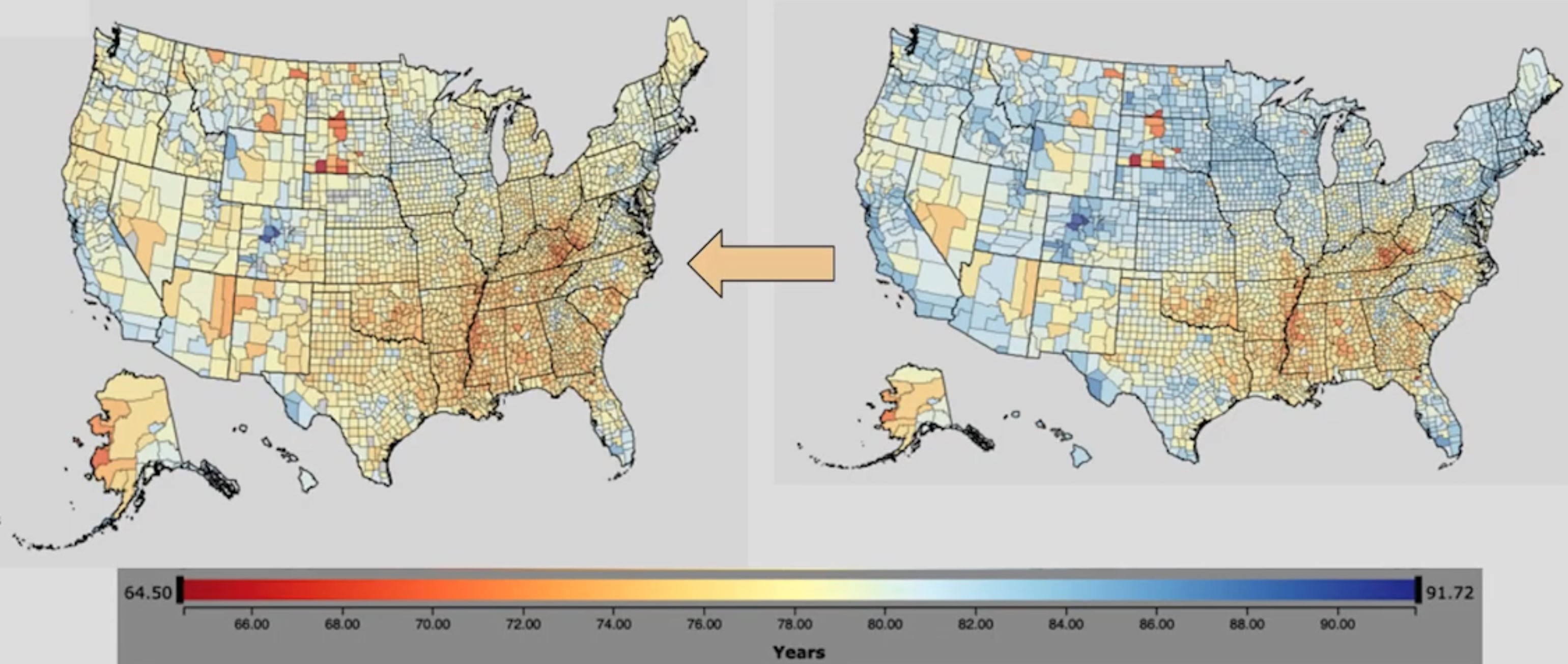 LIFE EXPECTANCY from 2014 to 2019 ( so many more ORANGE/RED and fewer BLUE )